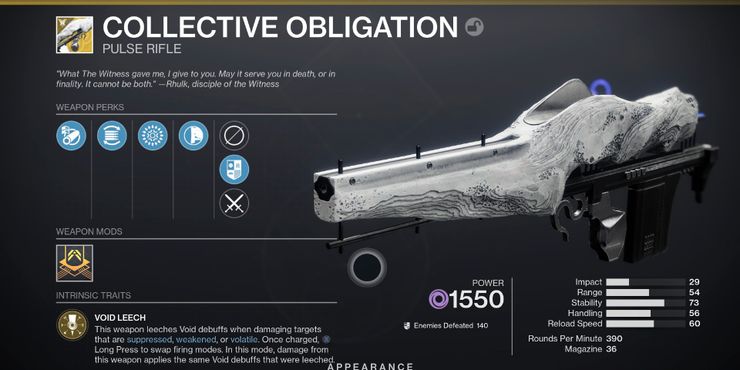 Con su rasgo intrínseco Void Leech, Collective Obligation absorbe la desventaja Void mientras daña a los objetivos que están suprimidos, debilitados o volátiles. Al usar la acción de arma alternativa, los jugadores pueden cambiar el modo de disparo del rifle de pulso de vacío para aplicar daño de las mismas desventajas de vacío que absorbió. Además, su rasgo Exótico, Umbral Sustenance, recarga automáticamente el arma cuando los jugadores obtienen el efecto Devorar, se les aplica un escudo de vacío o se vuelven invisibles.