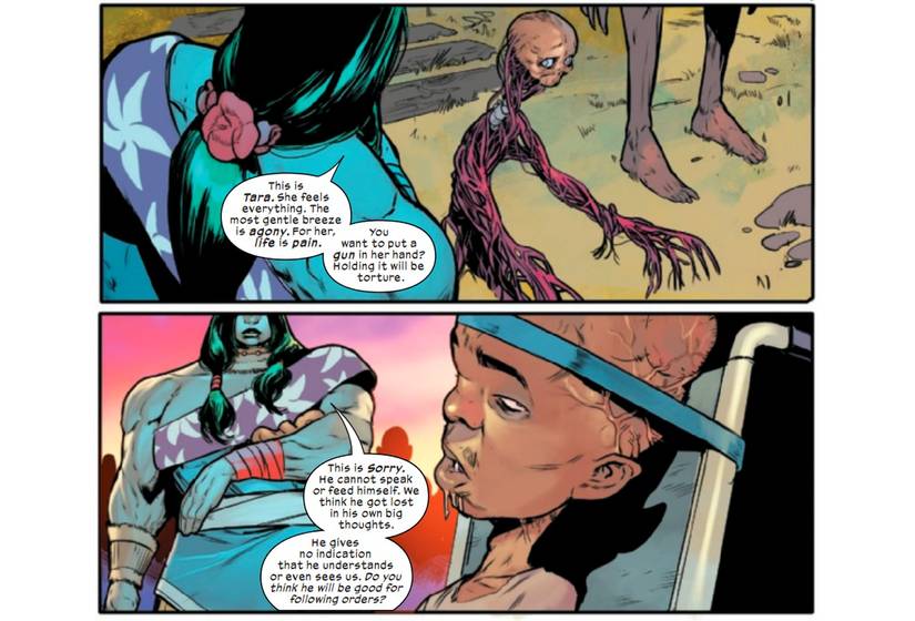 Lamentablemente, eso no es lo que encuentran. El número revela que el “Director Banner”, uno de los secuaces de Maker en este universo, sometió deliberadamente a personas inocentes a radiación gamma, estudiando sus efectos sobre ellos y la flora y fauna de la isla. She-Hulk revela que, si bien la radiación les otorga mayor fuerza a algunos individuos raros, la mayoría sufre mutaciones aleatorias. Presenta a varios “Hulks” que viven con un dolor constante, incluida una niña que es solo un esqueleto y un sistema circulatorio, y explica: “La brisa más suave es una agonía. Para ella, la vida es dolor.” En última instancia, She-Hulk hace acepta ayudar a los Ultimates a luchar contra el Creadorpero sólo si Tony puede encontrar una manera de eliminar la radiación de la isla.