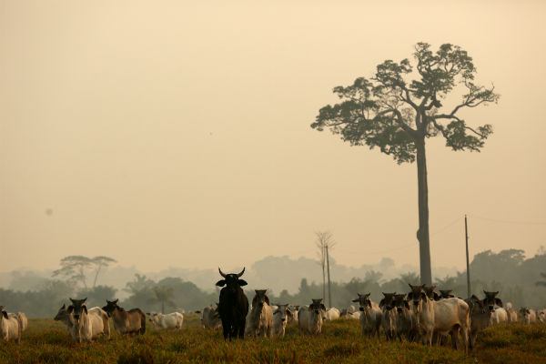 Ganado caminando en una zona del Amazonas después de incendios ocurridos.