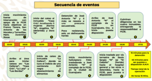 El titular de la Sedena indicó que el personal militar que participó en la operación solicitó el apoyo y acompañamiento de la Fiscalía General del Estado y tomó la decisión de intervenir los cuatro domicilios de manera simultánea durante la madrugada del 2 de agosto, a los cuales se les mantuvo una vigilancia aérea con medios no tripulados, mientras que personal de campo fue desplegado en las probables rutas de escape que se ubicaron en cada uno de los municipios.