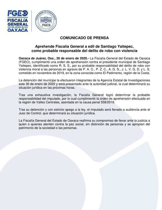 Esta detención se da en el marco de una orden de aprehensión por su probable responsabilidad en el delito de robo contra varias personas cometido en noviembre de 2019 en la zona conocida como El Pedimento en Santa Catarina, Juquila Oaxaca.