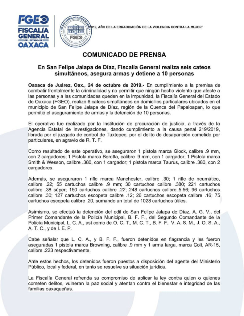 Arturo García Velásquez, alcalde del municipio de Jalapa de Díaz, fue detenido la madrugada de este jueves junto con otras nueve personas más, entre ellas policías municipales.