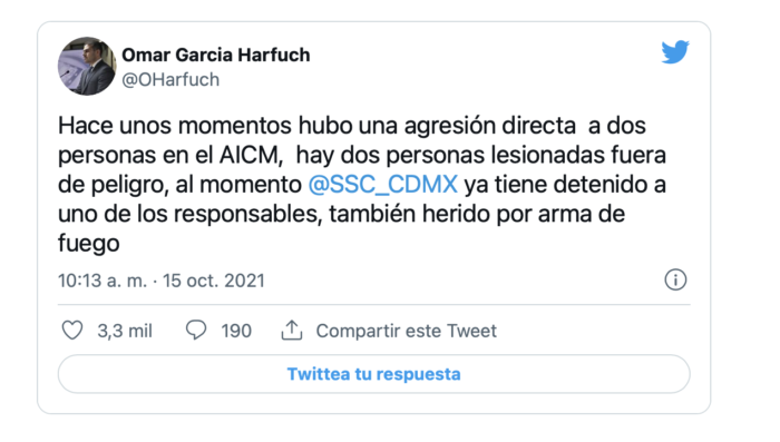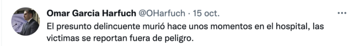 Minutos después, García Harfuch informó que “el presunto delincuente murió en el hospital, las víctimas se reportan fuera de peligro”.
