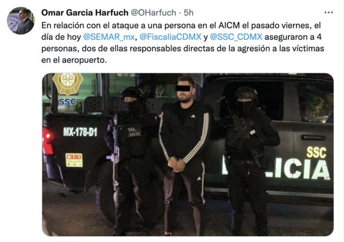 En un tuit, el jefe de la policía capitalina, Omar García Harfuch, indicó que dos de las personas detenidas son responsables directas de la agresión.