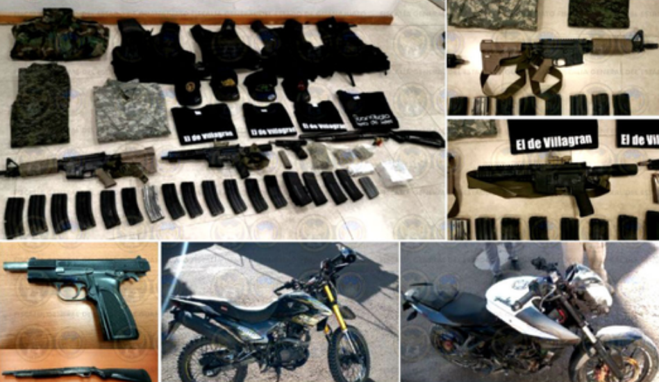A estos sujetos se les aseguraron armas de fuego, cartuchos, ropa, chalecos tácticos, gorras, playeras con insignias del grupo criminal y diversas dosis de hierba verde, al parecer mariguana, dos motocicletas con reporte de robo en los municipios de Villagrán y Cortazar.