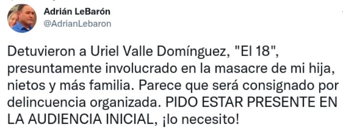 Horas antes, el activista y familiar de las víctimas, Adrián LeBarón, anunció a través de su cuenta de Twitter la detención de ‘El 18’, y pidió estar presente durante su audiencia inicial.