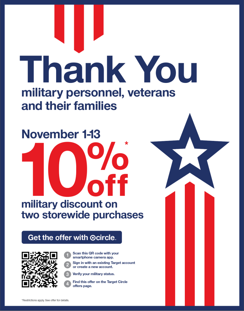 Los veteranos, los miembros militares en servicio activo y sus familias pueden obtener un 10% de descuento en pedidos en la tienda o en línea. El descuento por reconocimiento militar se extiende hasta el 13 de noviembre y se puede usar en dos transacciones separadas. Los clientes deben registrarse primero en www.target.com/circle/military para confirmar que cumplen el requisito.
