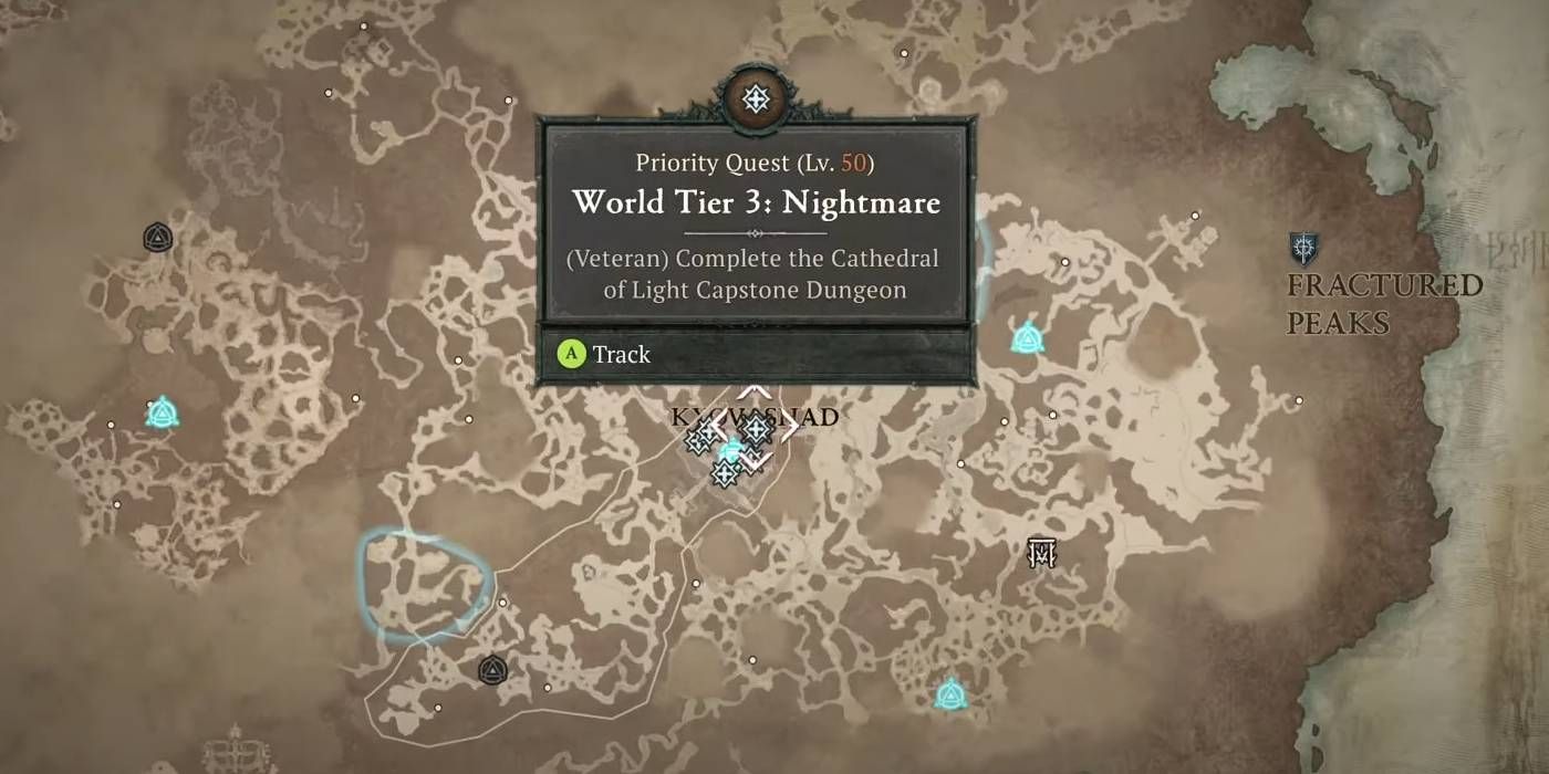 “/> Desbloqueas el nivel mundial 3: Pesadilla en Diablo 4 por completando una mazmorra Capstone tu personaje puede acceder en el Catedral de la Luz en Kyovashad. Una vez que termines los eventos finales de la historia del juego, aparecerá una nueva misión principal en tu mapa, que muestra dónde está la mazmorra Capstone. Esta misión está diseñada para veteranos, con personajes entre niveles 50-70 tener la mejor oportunidad de tener éxito.