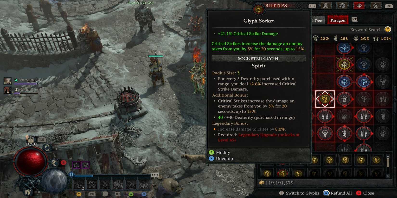 Si bien el Tablero Paragon puede cambiar una vez que el jugador adquiere elementos únicos míticos, esta configuración del Tablero Paragon debería durar un tiempo. El glifo espiritual se usa para aumentar el daño de golpe crítico, que es clave para Quill Volley. El segundo Glifo, Ritual, es utilizado para aumentar la potencia de Mystic Circlesque están permanentemente arriba.
