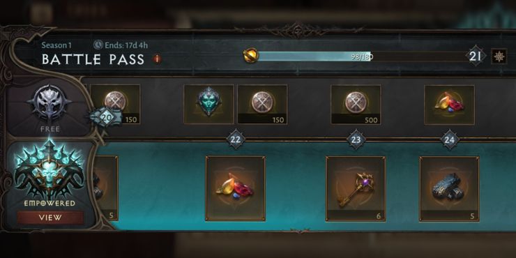 Casi todos los rangos en el Pase de batalla gratuito para diablo inmortal tiene 150 o 500 empuñaduras como recompensa. Aunque hay recompensas valiosas para el Pase de batalla premium, no es necesario comprarlo si los jugadores solo lo usan para cultivar Hilts. Se puede recolectar un total de 7,900 Hilts por completar el Pase de batalla, pero puede ser difícil alcanzar el rango 40. Las formas más fáciles de subir de nivel el Pase de batalla son desbloquear tres páginas de Bestiario todos los días, completar la actividad destacada para ganar el doble de Batalla. Puntos y termina las misiones enumeradas en la página de misiones del Pase de batalla. Cada nivel requiere 180 puntos de batalla y algunas actividades otorgan 60 o más. Para obtener empuñaduras, los jugadores deben completar las actividades del Pase de batalla que otorgan la mayor cantidad de puntos para que puedan subir de rango rápidamente.
