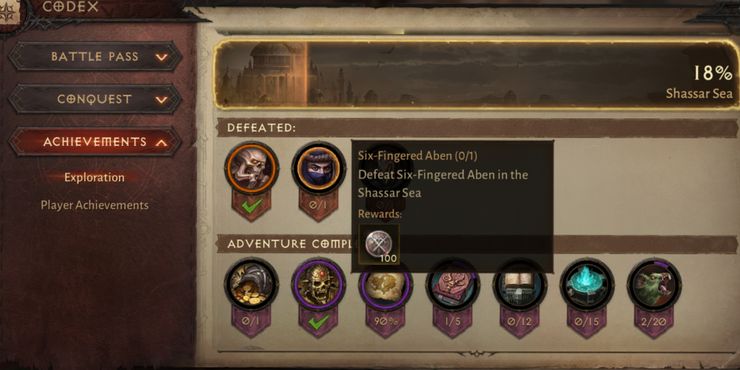 Las ocho regiones tienen logros que se pueden rastrear en la última pestaña del Codex. Todos los logros de exploración otorgan empuñaduras al finalizar, pero la cantidad varía. La mayoría de los logros otorgan 60 o 100 empuñaduras, pero algunos solo otorgan 40 una vez que se completa el desafío. Completar guaridas ocultas, encontrar NPC específicos, derrotar a jefes y completar misiones secundarias son parte de la sección de logros. Es posible que algunas de las actividades deban completarse varias veces antes de recibir una recompensa. Por ejemplo, los jugadores pueden ganar 60 empuñaduras por derrotar al recaudador de impuestos como parte del evento Haunted Carriage en diablo inmortalpero debe hacerse cuatro veces para desbloquear el logro y reclamar las empuñaduras.