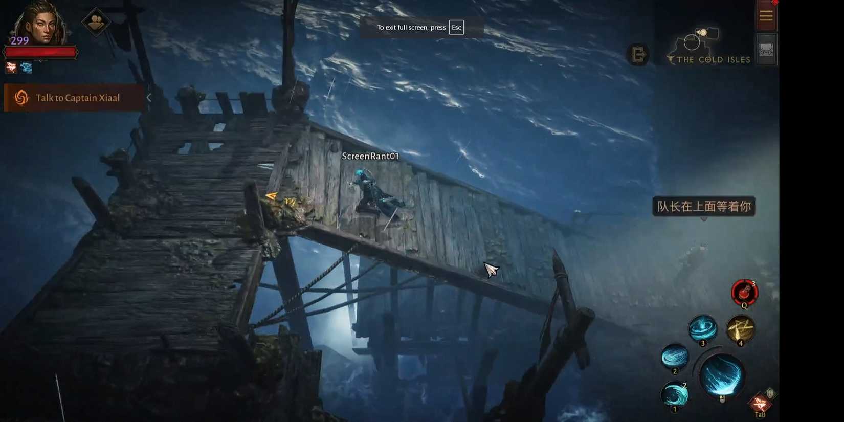 Te fortaleces con el mar y esto cambia tu ataque primario para enviar espadas de agua a los enemigos. Tu velocidad de movimiento también aumenta mientras montas una ola, lo que te permite moverte y atacar.