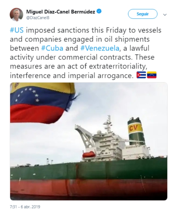 Díaz-Canel alude a las sanciones que anunció EU el viernes contra 34 buques petroleros y dos compañías que participan en el transporte de crudo venezolano a Cuba.