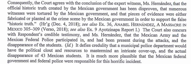 En el marco de una solicitud de asilo político hecha por un testigo clave del caso, la Juez Molly S Frazer determinó que la versión oficial dada por el gobierno de Enrique Peña Nieto fue creada en base a “tortura” para inventar testimonios. Y afirmó que “piezas de evidencia fueron igualmente fabricadas o sembradas en la escena del crimen por el gobierno de México con el fin de sustentar la falsa verdad histórica”.