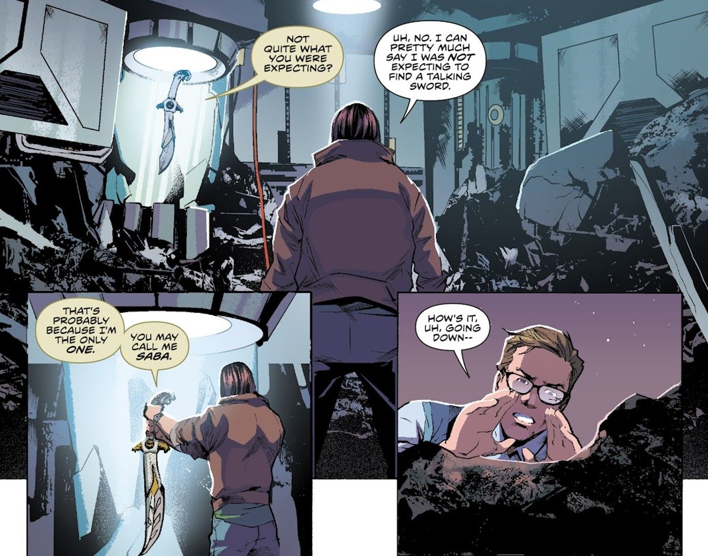 “/> La explosión de la destrucción del Dragón Negro es lo suficientemente grande como para enviar a Billy y Tommy al mundo post-apocalíptico de los Sin Monedas, superado por el creador del Dragón Negro, Lord Drakkon. Tommy se topa con las ruinas del Centro de Comando y encuentra una espada parlante llamada Saba, que habría pertenecido al White Ranger Jason si la Transferencia de Poder de Zordon no hubiera sido interrumpida. Con Billy y Tommy todavía indefensos, Saba inmediatamente reconoce a Tommy como alguien lo suficientemente digno como para manejarlo.lo que resulta fundamental para la supervivencia del dúo.