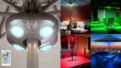 Una sombrilla puede ser también un refugio perfecto al aire libre durante la noche. Y ahora también puedes mantener ese espacio iluminado, gracias a esta luz especial, que se instala fácilmente en la parte superior del tubo de la sombrilla para ofrecer una iluminación LED brillante. Además, incluye un mando a distancia con el que se pueden elegir sus 20 modos de brillo y sus 12 diferentes colores. Funciona con seis pilas AA.