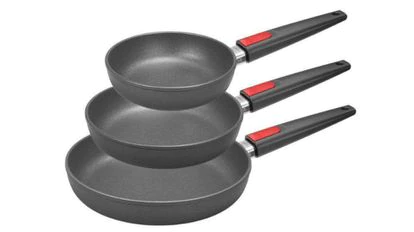 Fabricadas en Alemania con tecnología avanzada y acabado artesanal, cumplen las certificaciones del Instituto Federal Alemán de Sanidad. Un producto diseñado para cocinas de inducción y revestido con un acero especial, patentado por la marca alemana. Ello favorece que no se acumule el calor en su base y se distribuya de manera uniforme. Sus paredes tienen cinco cm de altura y los tamaños van desde los 20 hasta los 28 cm de diámetro. Pueden usarse también en otro tipo de cocinas.