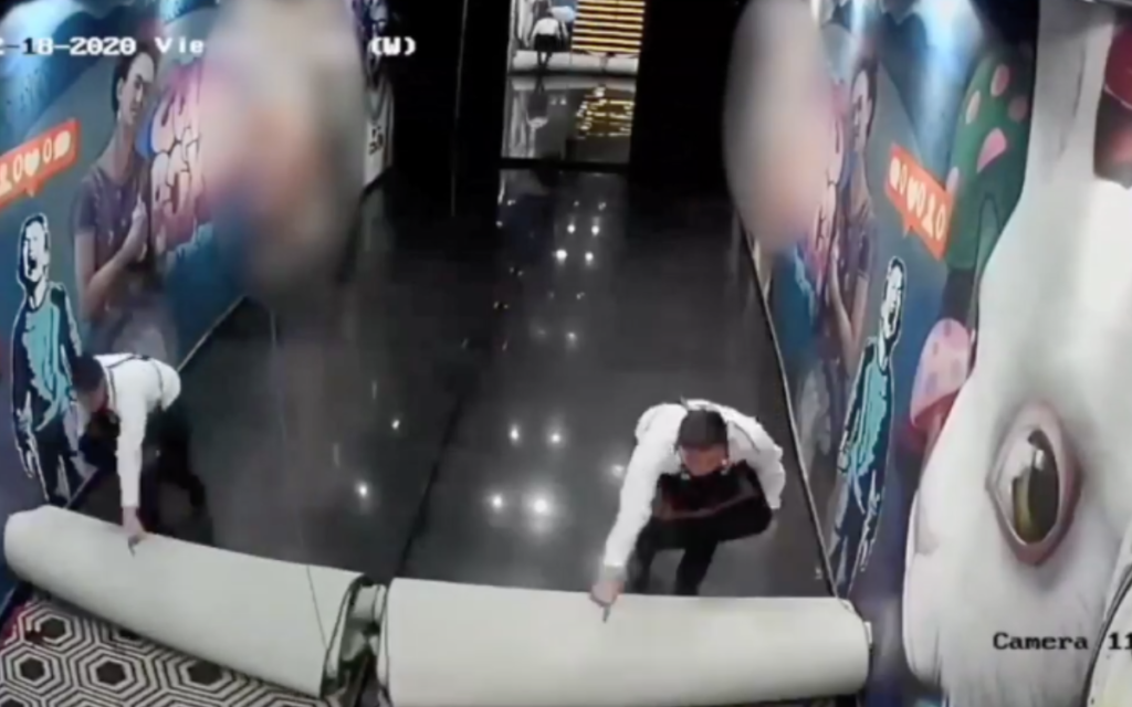 Cuatro sujetos, todos vestidos con el uniforme de trabajo se observan retirando la alfombra de manera rápida para finalmente realizar labores de limpieza. Por estos motivos, las investigaciones de parte de las autoridades continúan.