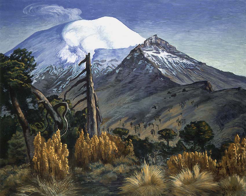 Gerardo Murillo le llama “la Iztaccíhuatl”. Él sí sabía. Es una mujer respetable. Así la siguen llamando los campesinos que habitan sus faldas: la volcana que se aparece, con su larga cabellera, a tallar su ropa en los lavaderos que tiene a un costado de su vientre. Pero, como bien afirmaba el Dr. Atl, el Popocatépetl es otra cosa y “me obliga a considerarlo aisladamente”. No creo que este extraordinario y controversial hombre haya tenido mayor fascinación en la vida. Los volcanes rebasaron la belleza y el talento de Nahui Ollin, que ya es mucho decir. Subió a la cumbre del Popo en pleno proceso eruptivo, aún con muletas, cuando ya había perdido una pierna, y nos dejó una información insuperable sobre este volcán, el mejor testimonio del periodo eruptivo que, a su entender, duró entre 1919 y 1938. Su amor y fascinación por los volcanes se virtió también en el nacimiento del Paricutín, dejando imágenes artísticas sin iguales.