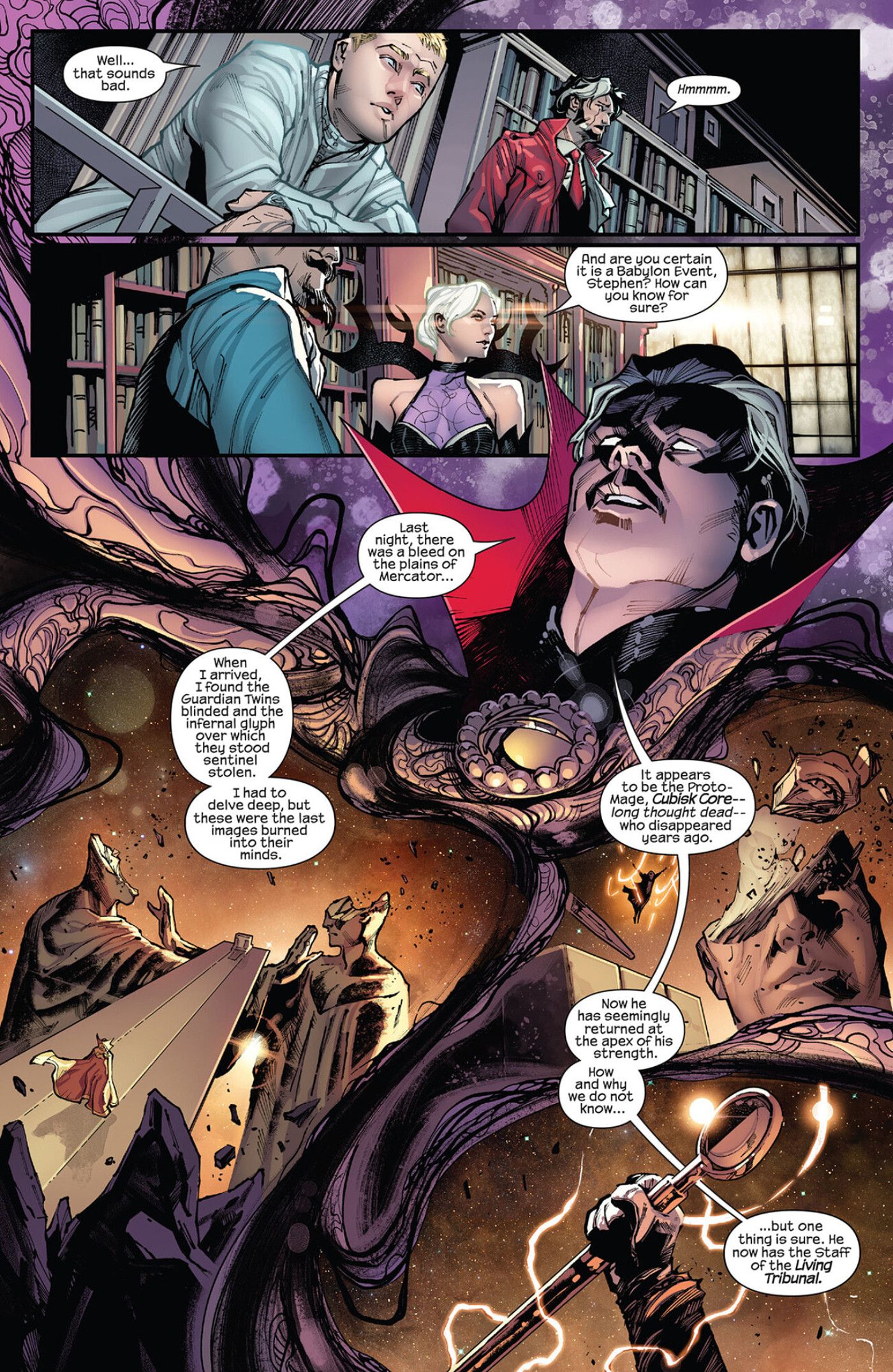 “/> DIOSES El número 1 está escrito por Jonathan Hickman y dibujado por Valerio Schiti. El número de gran tamaño recorre varios períodos de tiempo y cuenta la historia de Wyn y Aiko, un matrimonio que se encuentra en lados diferentes en una gran guerra. Una fuerza misteriosa llamada Cubisk Core ha robado el Bastón del Tribunal Viviente, un arma de gran poder destructivo. Wyn y Doctor Strange convocan una reunión en la Biblioteca de los Mundos, donde revelan que se avecina un “Evento de Babilonia” para todos y que deben trabajar juntos para detenerlo.