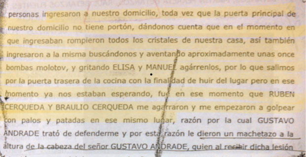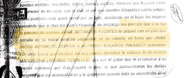 “Me percaté que a mi hija la persona de nombre Jaime Betanzos Fuentes la golpeó con un palo que portaba en su mano derecha pegándole en la cabeza, en tanto Jaime Jacob Betanzos Zepeda y Alfredo Bolaños Pacheco golpeaban con unos tubos que llevaban en sus manos derechas la cabeza de mi esposa Magdalena Lagunas Ceballos”.