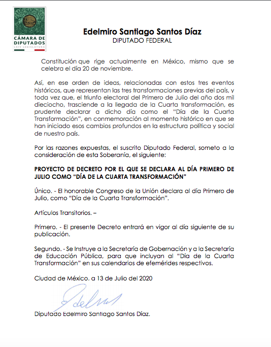 El diputado de Morena, Edelmiro Santos, propuso formalmente declarar el 1 de julio como “Día de la cuarta transformación”, en referencia a que ese día obtuvo el triunfo, hace dos años, el actual presidente Andrés Manuel López Obrador.