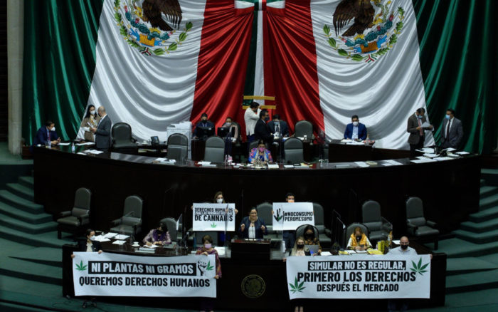 Los morenistas desplegaron mantas con frases como “Ni plantas ni gramos, queremos derechos humanos” y “Simular no es regular, primero los derechos después el mercado”.