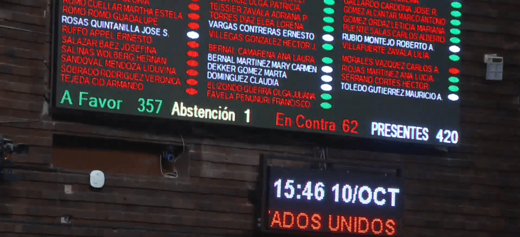 El pleno lo aprobó por mayoría calificada con 357 votos a favor, 62 votos en contra y 1 una abstención; pasa al Senado de la República para sus efectos constitucionales.
