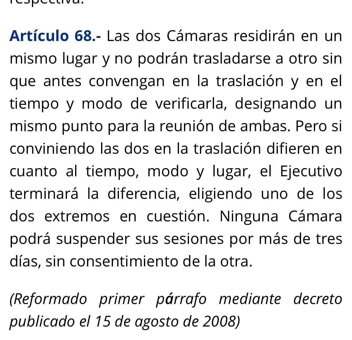 El citado artículo define: “Las dos Cámaras (del Congreso) residirán en un mismo lugar y no podrán trasladarse a otro sin que antes convengan en la traslación y en el tiempo y modo de verificarla, designando un mismo punto para la reunión de ambas. Pero si conviniendo las dos en la traslación, difieren en cuanto al tiempo, modo y lugar, el Ejecutivo terminará la diferencia, eligiendo uno de los dos extremos en cuestión. Ninguna Cámara podrá suspender sus sesiones por más de tres días, sin consentimiento de la otra“.