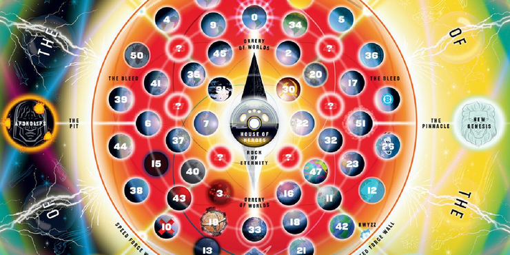 Thawne también afirmó que la caja de Diggle fue forjada en un lugar llamado Orrery of Worlds. Introducido por primera vez en la preparación para el última crisis evento y más explorado en el multiversidad serie, el Orrery of Worlds es el nombre dado a las 52 Tierras paralelas vigiladas por la raza Monitor que surgió para proteger el nuevo Multiverso tras la muerte del Monitor original después de la Crisis en tierras infinitas mini series. La mención de Thawne del Orrery of Worlds sugiere que algo similar sucedió en el nuevo multiverso que se formó después del evento Arrowverse Crisis on Infinite Earths.