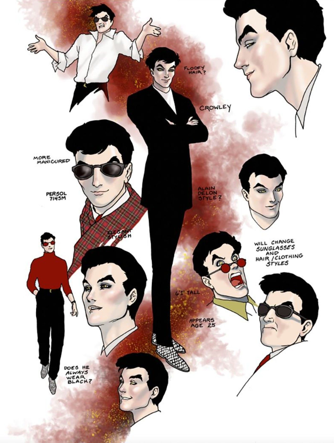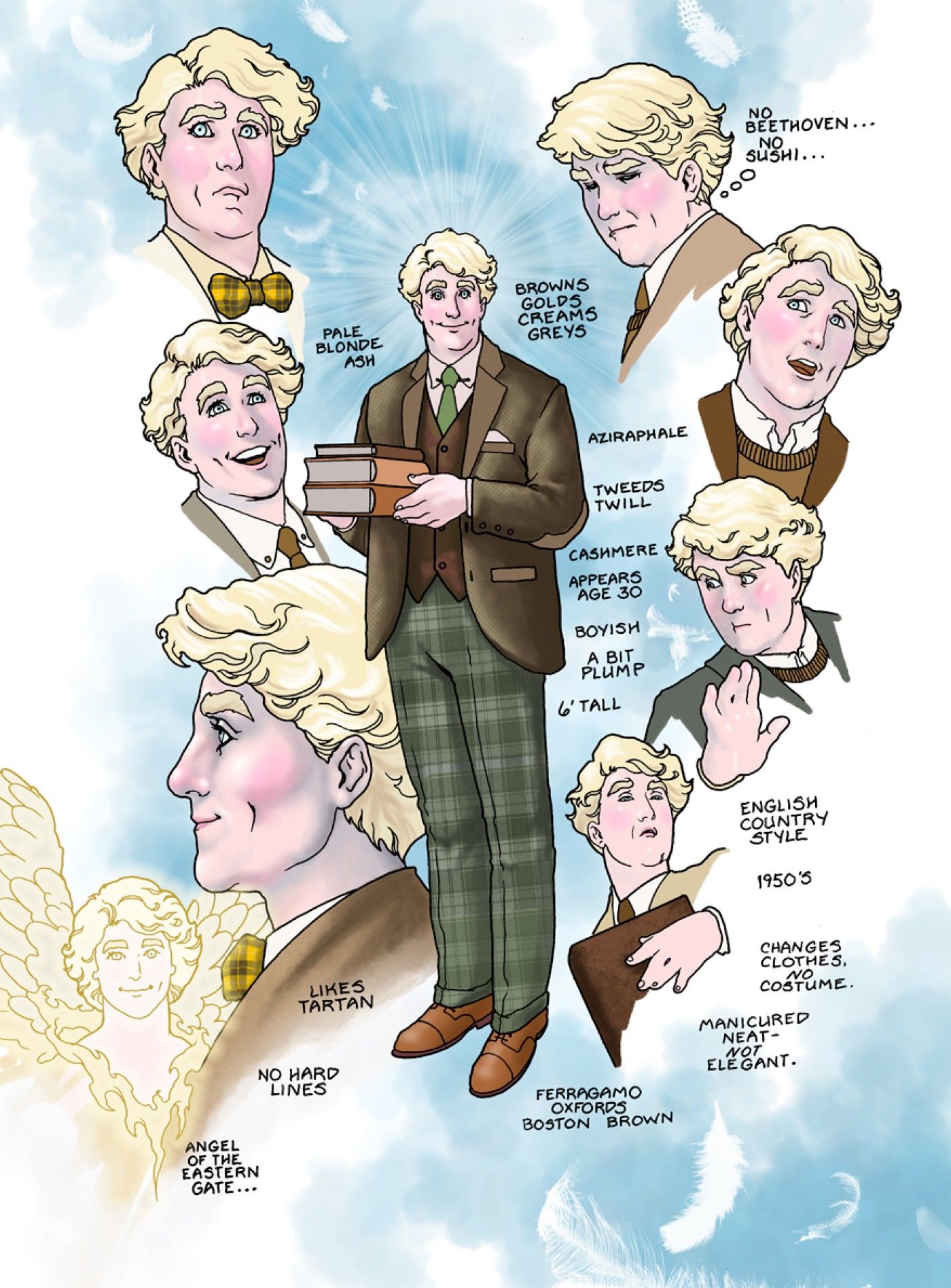 Los modelos de personajes de Doran están repletos de detalles de los personajes, como los colores que definen a cada personaje y detalles sobre su altura, estilo e incluso la forma angelical de Azirafel.