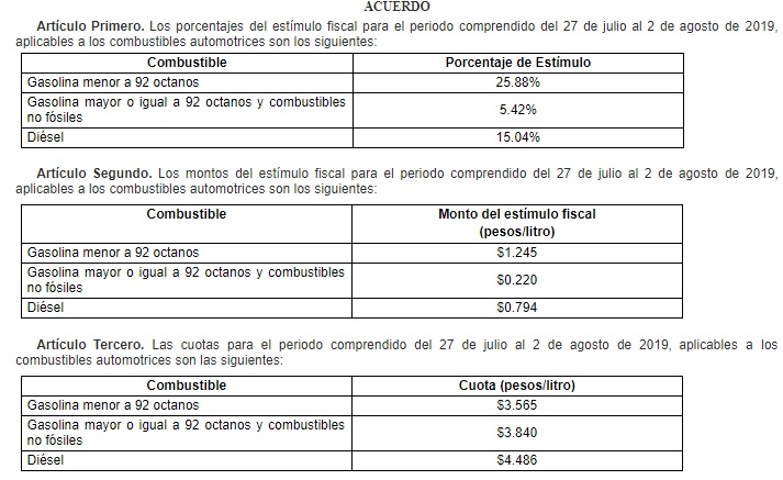 En el Diario Oficial de la Federación (DOF), la dependencia publicó los porcentajes y los montos del estímulo fiscal, así como las cuotas disminuidas del IEPS aplicables a los combustibles, correspondientes al periodo comprendido del 27 de julio al 2 de agosto de 2019.