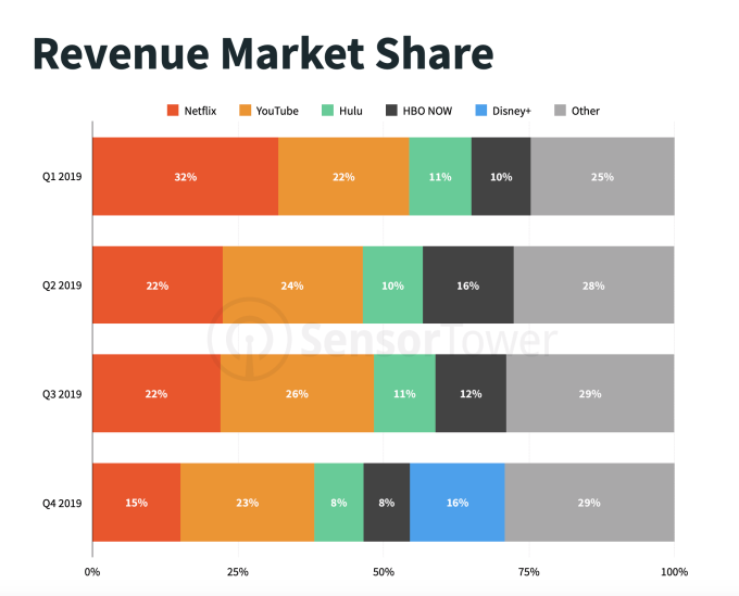 Aunque la aplicación capturó de inmediato el 34% de las descargas de SVOD del cuarto trimestre en el lanzamiento, Sensor Tower señala que las descargas de otras aplicaciones de SVOD aún crecieron un 12,5% trimestre a trimestre en el cuarto trimestre de 2019 y un 4,7% año tras año. Eso podría indicar que Disney + no está canibalizando otras aplicaciones en el mercado de transmisión, está expandiendo el mercado.