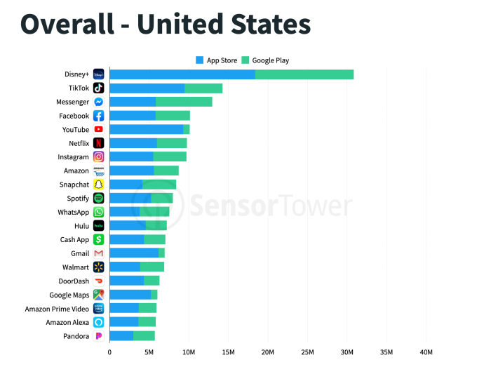 En la App Store, Disney + venció a YouTube y TikTok por el puesto número 1, después de que YouTube había ocupado la primera posición durante los últimos cuatro trimestres. La aplicación también alcanzó un hito notable en Google Play, ya que ninguna otra aplicación había superado los 10 millones de descargas de EE. UU. En Google Play en un trimestre desde que Facebook Messenger lo hizo en 2017.