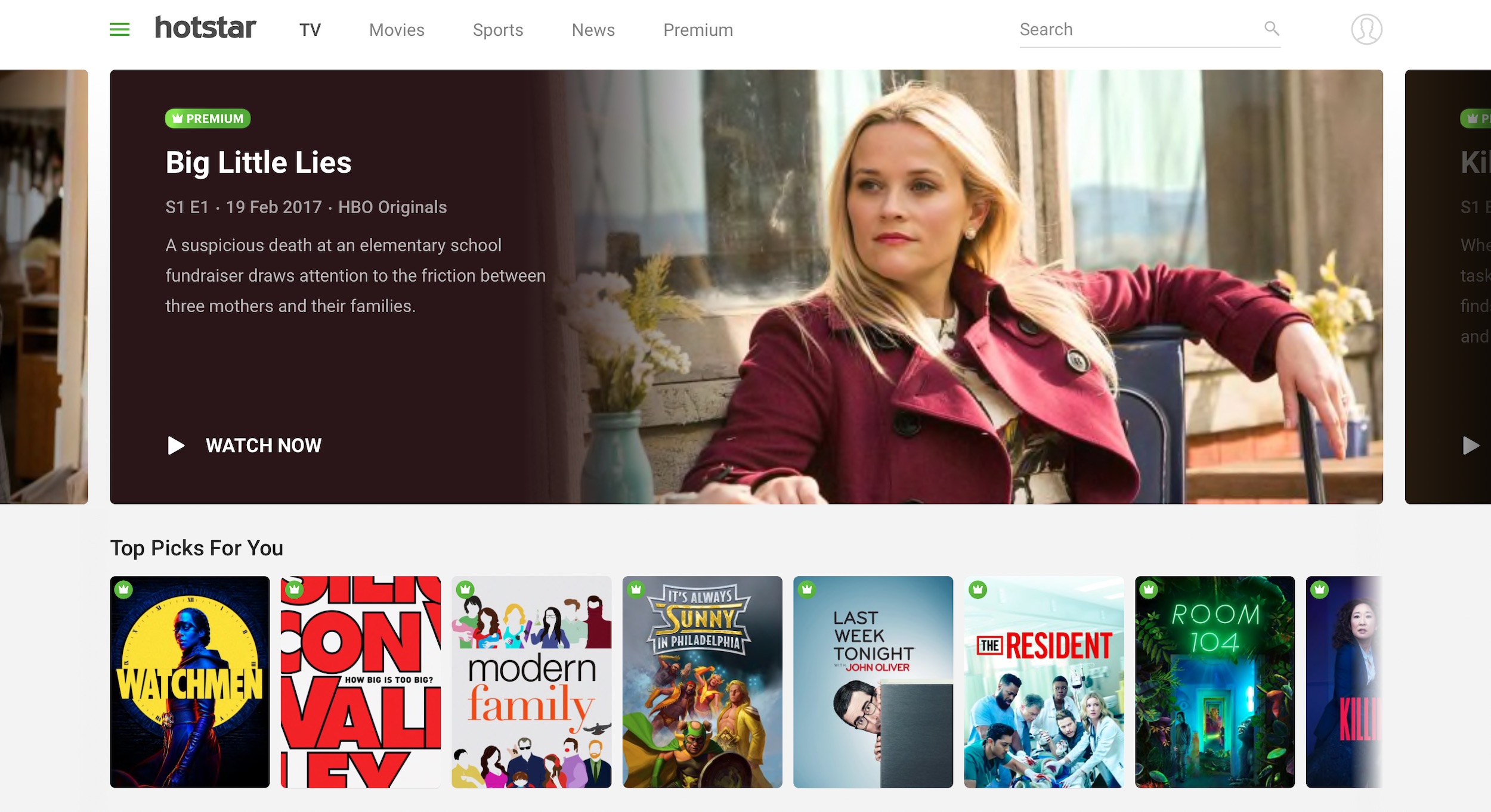 Hotstar ofrece una gran biblioteca de películas y títulos locales sindicados de redes y estudios de cable internacionales Showtime, HBO, y ABC (también propiedad de Disney). En sus mercados internacionales actuales, el catálogo de Hotstar se limita a algunos contenidos locales y una gran biblioteca de títulos indios.