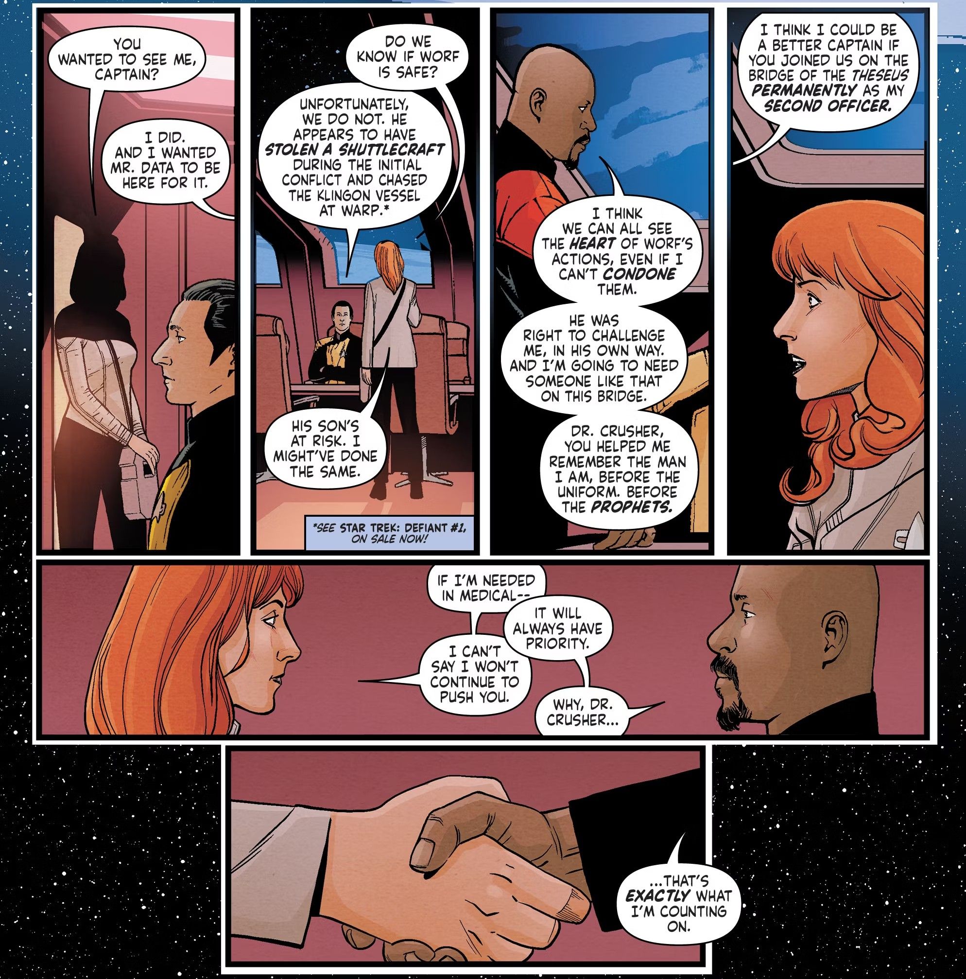 El número está escrito por Jackson Lanzing y Collin Kelly, dibujado por Ramon Rosanas, coloreado por Lee Loughridge y rotulado por Clayton Cowles. Sisko y la tripulación del Teseo han convencido a la Ciudad de Dios de T’Kon de no atacar la Tierra. Posteriormente, el Capitán Sisko le pide al Doctor Crusher que se reúna con él en Ready Room. Cuando llega, pregunta por Worf. Sisko le dice que no conoce el estado de Worf, pero se culpa a sí mismo por la partida de Worf. Sisko le dice al Doctor Crusher que necesita a alguien que lo desafíe en el puente, para mantenerlo honesto. Felicita al Doctor Crusher por ayudarlo a “recuerda el hombre que fuey luego le pide que sea su segundo oficial.