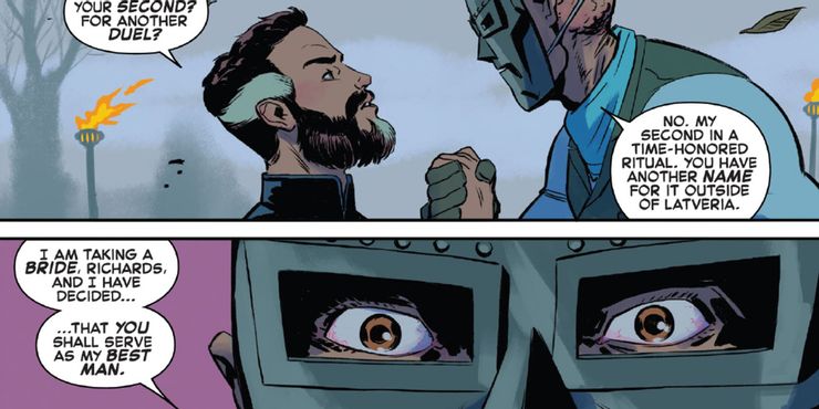 Dejando de lado las comodidades de la trama, Doom probablemente no tenga muchas opciones para su padrino, considerando que está alienado y se ha convertido en el enemigo de casi todos los que ha conocido. Elegir a su ex amigo Reed para que esté a su lado mientras se casa con Victorious tampoco tiene mucho sentido, ya que está enemistado y trató de matarlo a él y a su familia en múltiples ocasiones, pero desde que perdió el duelo, está obligado a hacerlo. hazlo … por razones.