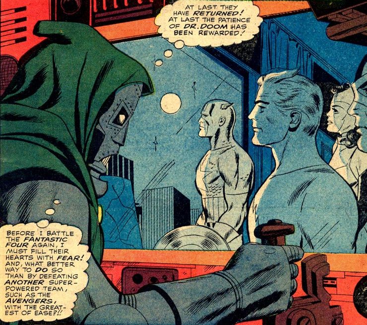 En Vengadores # 25 de Stan Lee y Don Heck, los Vengadores, un equipo que, en ese momento, estaba formado por el Capitán América, Hawkeye, Scarlet Witch y Quicksilver, acababa de terminar una batalla a través de la corriente temporal contra Kang the Conqueror cuando se encuentran en el punto de mira del Doctor Doom. En este punto, los lectores probablemente se preguntaban por qué un villano establecido de los Cuatro Fantásticos se molestaría en espiar a los Vengadores, y ni siquiera al equipo original. Bueno, Doctor Doom resume perfectamente sus motivos en las primeras páginas de este número, diciendo: “¡Antes de volver a luchar contra los Cuatro Fantásticos, debo llenar sus corazones de miedo! ¡¿Y qué mejor manera de hacerlo que derrotando a otro equipo superpoderoso, como los Vengadores, con la mayor facilidad?!”.