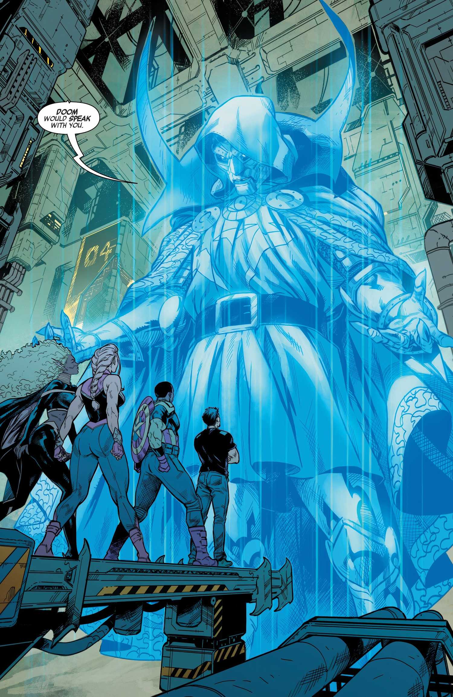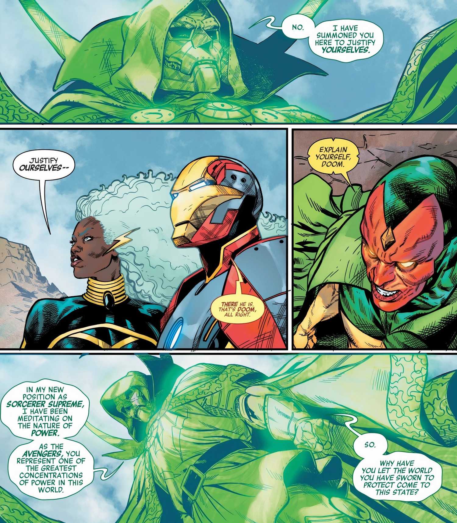 Mientras tanto, dentro de la cúpula de hierro de Latveria, su gente prospera. Es necesario sacrificar algunas libertades, pero a cambio, Doom ha regalado a su pueblo paz, prosperidad y seguridad frente al caos constante que azota a su pueblo. Los Vengadores han fracasado para gestionar. Los héroes de la Tierra juzgan rápidamente, pero a menudo son incapaces de discutir la prosperidad del pueblo latveriano. Como Doom convoca a los Vengadores a responder por sus frecuentes fracasosexige saber por qué han “dejado que el mundo [they] ¿Habéis jurado proteger y habéis llegado a este estado? Doom castiga a los héroes por carecen de la unidad necesaria para construir un mundo mejor.
