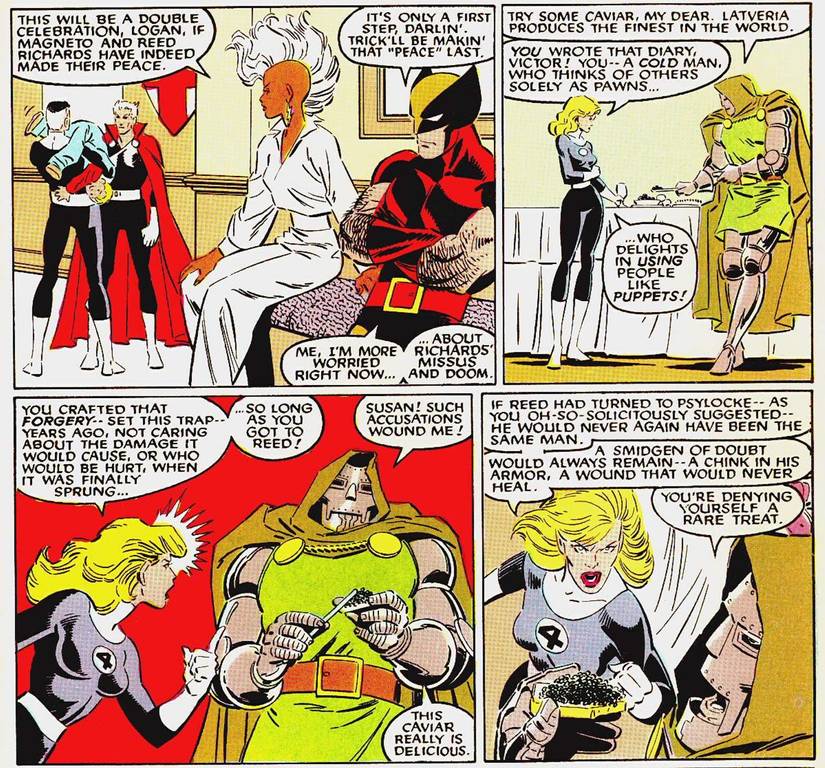 Doctor Doom se obsesiona con el caviar mientras Sue Storm lo acusa de falsificar el diario de Reed