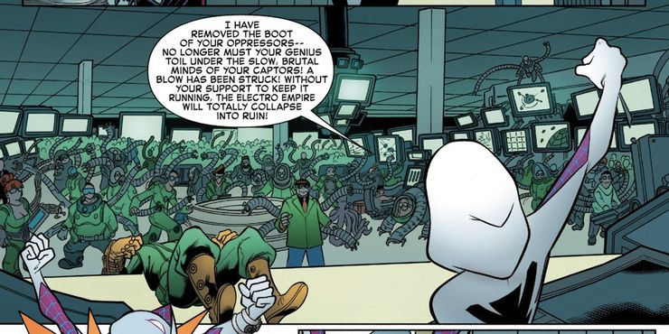 El 616 Doc Ock en realidad no se encontró con este grupo de variantes del Doctor Octopus, pero no como Otto Octavius. Como el Spider-Man superior, Doc Ock estuvo muy involucrado en el crossover Spider-Verse. De hecho, se convirtió en un antagonista en el epílogo de la serie, donde se vio obligado a regresar a su propio lugar en la línea de tiempo en contra de su voluntad. Si esto doctor pulpo había logrado dominar a los otros Spider-Men, es ciertamente plausible que se haya encontrado en el equipo de Web-Warriors y se haya encontrado con electro grupo esclavizado de sus variantes.