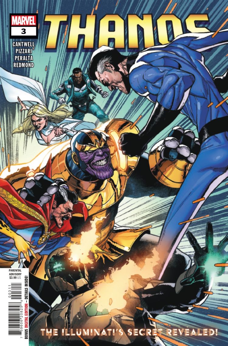 Thanos El número 3 está escrito por Christopher Cantwell y dibujado por Luca Pizzari y German Peralta. Los Illuminati, incluidos Doctor Strange, Emma Frost, Iron Man y Blue Marvel, han descendido sobre la ciudad de Fresno, California, que está bajo asedio de Thanos.