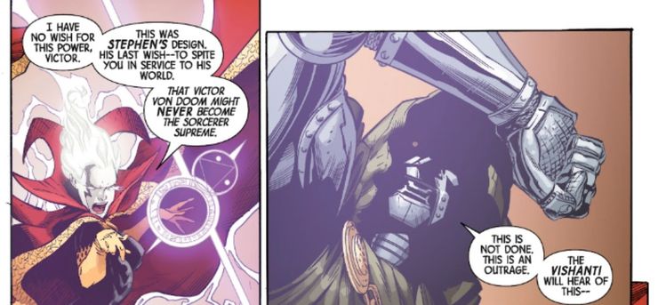 Divertidamente, en Extraño # 1 Clea revela la verdadera razón por la que hizo esto. Enfrentada por el Doctor Doom, quien cree que tiene derecho a convertirse en el nuevo Hechicero Supremo de la Tierra, ella revela que Strange arregló todo esto para fastidiar a Doom. “No deseo este poder, Víctor,Clea advierte al Doctor Doom.Este fue el diseño de Stephen. Su último deseo: fastidiarte al servicio de su mundo. Que Victor Von Doom nunca podría convertirse en el Hechicero Supremo.“