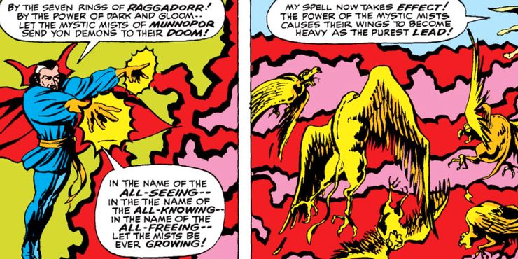 Otro hechizo con propiedades sombrías similares causa estragos en Strange Tales #154. Doctor Strange no solo ciega a los pájaros demoníacos que lo atacan, sino que también gira sus alas para liderar, demostrando que este es uno de los mejores hechizos de Marvel Comics en un panel rápido.