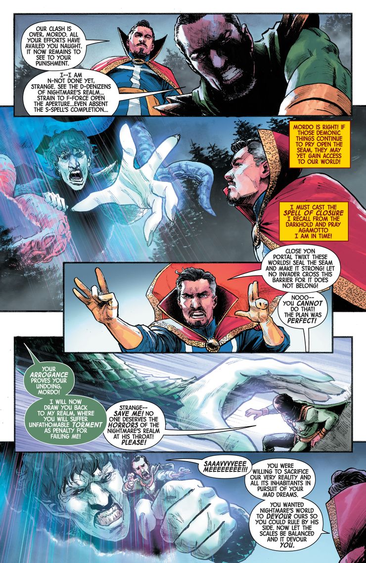 El último enfrentamiento entre Strange y Mordo, en Doctor Strange: El nexo de las pesadillas # 1, de Ralph Macchio, Ibrahim Moustafa y Neeraj Menon, vio a los dos enfrentarse una vez más por el título de Hechicero Supremo, con Mordo solicitando la ayuda del villano demoníaco Nightmare, para poner en duda las habilidades de Stephen para ser el protector de su dimensión. Cuando Mordo finalmente fue frustrado por Strange (gracias a la sabia sabiduría de Wong), Nightmare apareció para castigar a Mordo por sus transgresiones, arrastrándolo al reino de Nightmare, un destino horrible. Strange fue testigo de su captura sin objeciones, diciendo más tarde que había “poco [he] podría haber hecho” para salvarlo. Mordo que involucró a Nightmare en su plan puede haber amenazado la estructura de la realidad, pero Strange pudo despacharlo con relativa facilidad, pero aún así no mostró remordimiento por el espantoso destino al que ahora está destinado el Barón.