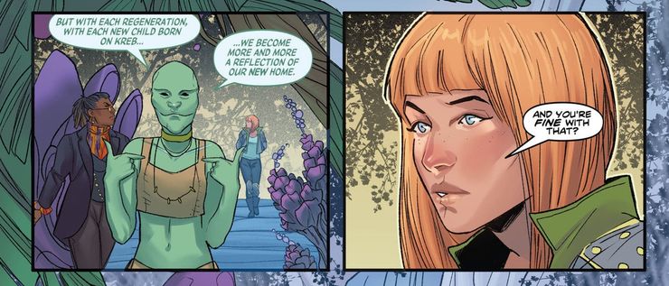 Doctor Who: Orígenes #2, por Jodie Houser, Roberta Ingranata y Warnia K. Sahadewa, explora esta idea. La historia está protagonizada por el médico fugitivo olvidado de Jo Martin, y pretende contar la historia de cómo llegó a huir de la División, la agencia de operaciones encubiertas para la que solía trabajar. La envían en una misión al planeta Kreb, con órdenes de acabar con los habitantes porque son vistos como una amenaza para Gallifrey. Al principio, el Doctor no reconoce a la raza aparentemente alienígena, hasta que uno de ellos muere y simplemente se regenera. Parece que Kreb era una colonia de Gallifreyan; con cada nueva regeneración, los Señores del Tiempo enviados a ese planeta se convirtieron en “cada vez más un reflejo de nuestro antiguo hogar.“