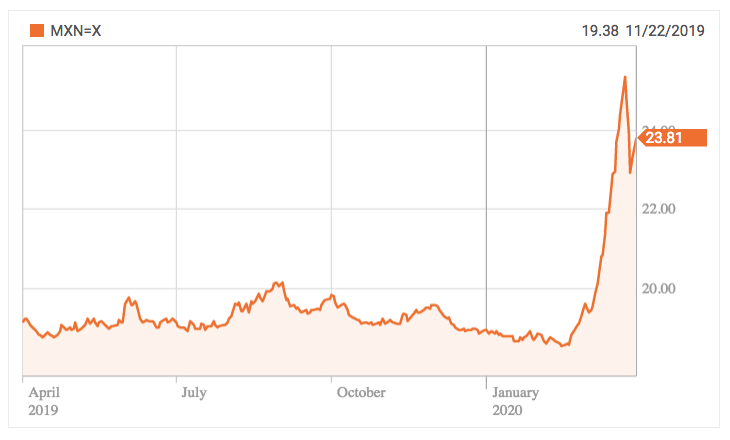 El peso mexicano se deprecia este lunes ante preocupaciones de que los cierres en todo el mundo por el coronavirus puedan derivar en una profunda recesión mundial.