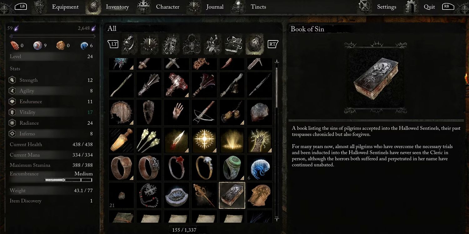 Desafortunadamente, darle a Exacter Dunmire el Libro del Pecado no da como resultado más que unas pocas líneas de diálogo del personaje. También puedes leer el libro para conocer la historia de Hallowed Sentinels. Aparte de eso, no obtienes ninguna recompensa por devolver el Libro del Pecadocomo desbloquear la clase Dark Crusader.