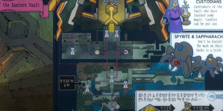 El camino para Debajo de la Bóveda del Este debería ser sencillo. Está oscuro y hay arañas enemigas que derrotar, pero habrá algunos pilares para activar en el camino, para que los jugadores puedan seguir la franja rosa en el suelo que conduce hacia y desde cada uno. También hay un mapa de esta zona subterránea en la página 30 del folleto de instrucciones. Pasar por el pasaje subterráneo eventualmente lo llevará de regreso al pilar previamente inaccesible en la sala principal. Hay un puente que se puede bajar antes de caer para luchar.