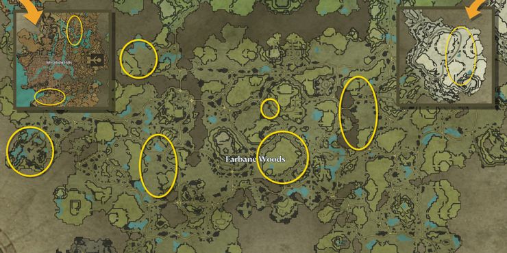 - Oeste y extremo sur del extremo sureste V ascendente Bandit Camp en Farbane Woods: nodos de mineral de azufre ×2 (oeste) y ×2 (sur)